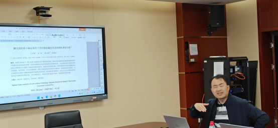 最后,副院长丁志刚分享了近期所做的研究工作,通过对《碳交易价格不确定条件下供应链低碳技术采纳期权博弈分析》、《政府监管下银行绿色信贷实施与供应链低碳技术采纳的演化博弈》等文章分享和申报国家社科基金项目《绿色金融驱动制造企业碳污共治的机制与政策研究》的详细解说,认为教师需要带领学生共同去探讨和研究科学问题,相互推动、相互促进、相互进步,让学生在做研究的过程中不断成长,同时也增强了自己的获得感。