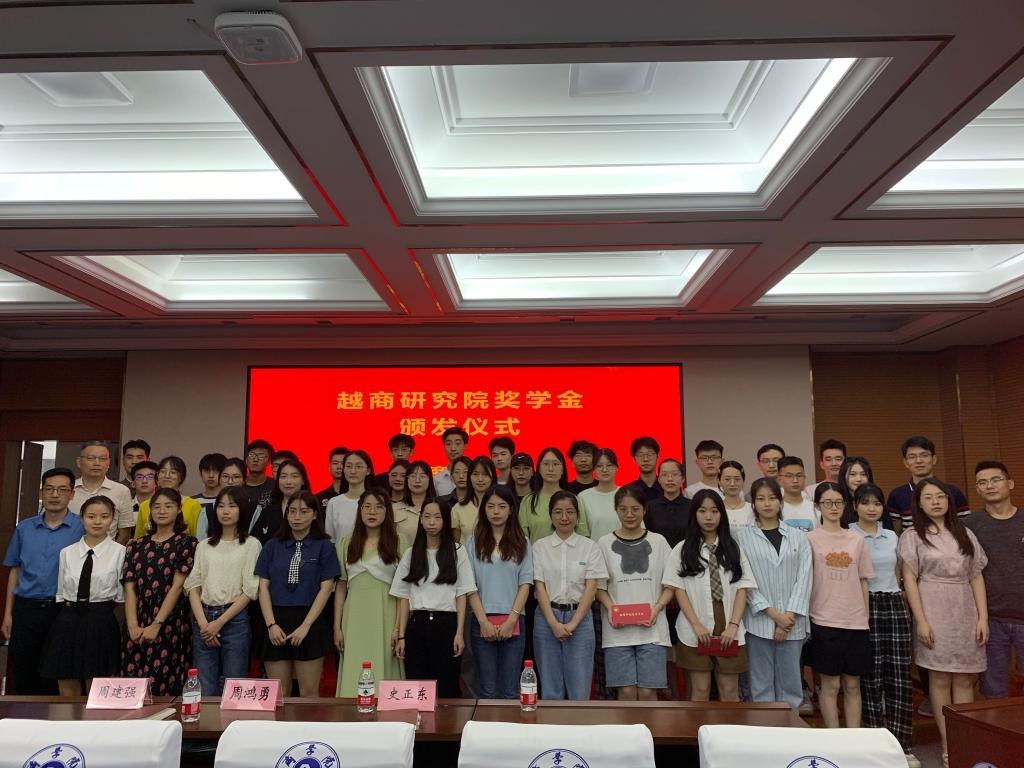 6月5日下午,pg电子中国官方网站在综合楼A405报告厅举行第一届越商研究院奖学金颁发仪式。院长周鸿勇、党委副书记(主持工作)史正东、党委副书记周建强、全体辅导员以及在校获奖学生出席颁发仪式。仪式由周建强主持。