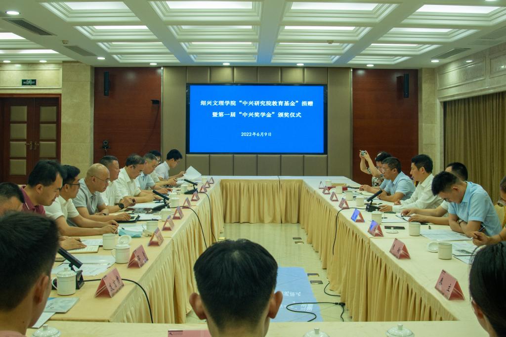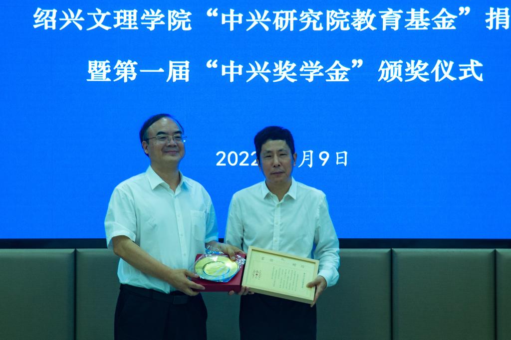 6月9日下午,“中兴研究院教育基金”捐赠暨第一届“中兴奖学金”颁奖仪式在铁城科教馆一楼会议室隆重举行。浙江中兴会计师事务所所长马洪明及事务所班子成员,绍兴市财政局会计处副处长张挺,校党委副书记沈赤、副校长黄坚,pg电子中国官方网站院长周鸿勇、党委副书记(主持工作)史正东、副院长严照良、副院长丁志刚、党委副书记周建强、副院长邵青及获奖学生代表参加颁奖仪式。仪式由周鸿勇主持。