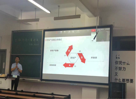 朱旺经理从金融产品创新和当下热点金融问题两方面展开演讲,他着重为同学们介绍了金融产品创新的主要核心——客户、出口信贷业务以及各类信贷产品的理念和现状。基于银行个人业务,他提到,客户是核心,银行卡是载体,产品是关键。