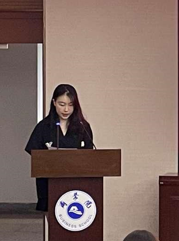 获奖学生代表工商管理183班曹乙婷同学发言。她向学院对考研学子的支持和帮助、向李生校老师的鼓励和栽培表示感谢,并承诺在未来读研的道路上将继续努力、专心学术、不负所望。