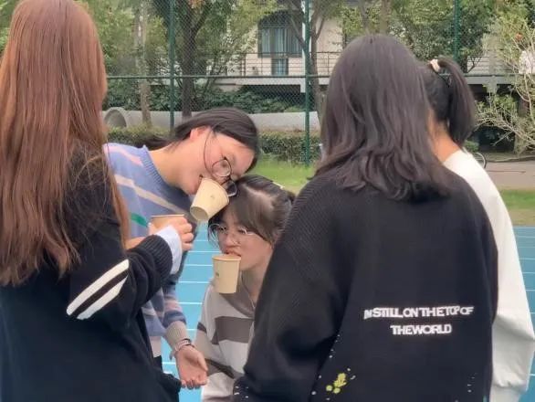 主持人将参与的同学分成几组,小组之间需团结合作,来通过衔纸杯的方式传递水源。比赛开始,大家齐心协力,确保杯中的水能一滴不漏。最终,男生组因水量较少位居最后,接受惩罚,为大家合唱《两只老虎》。